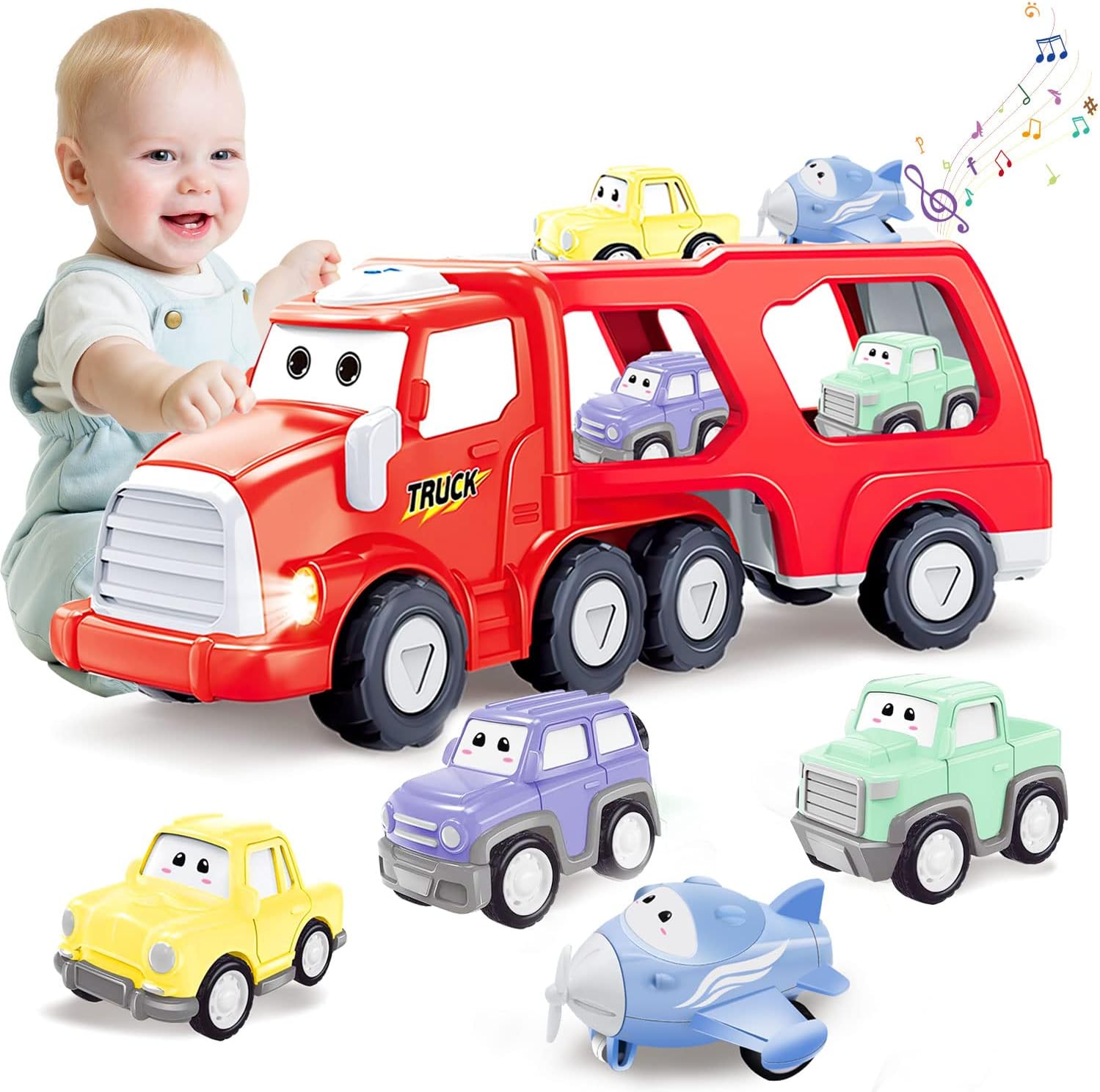 5 en 1 Carritos Juguetes Niño 3 a 8 Años, Camiones de Transporte Gran Cargado con 3 Mini Coches de Juguetes y 1 Avión, Carros Juguete con Sonido, Regalo para Fiesta, Navidad, Cumpleaños, Día de Niños