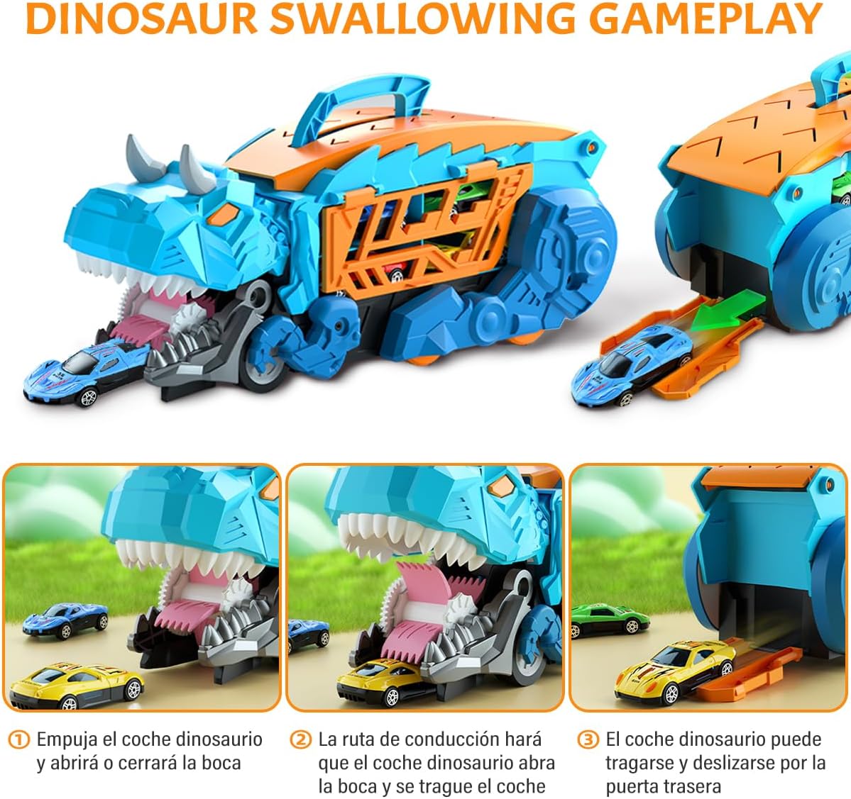 Dinosaurios de Juguetes, EASYTAO Pista de Dinosaurios con 12 Autos, Camión de Dinosaurio Transportador de Automóviles con Deslizante Plegable, Juguetes de Regalo para Niños y Niñas (Azul)
